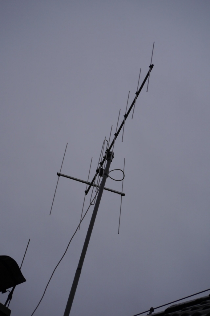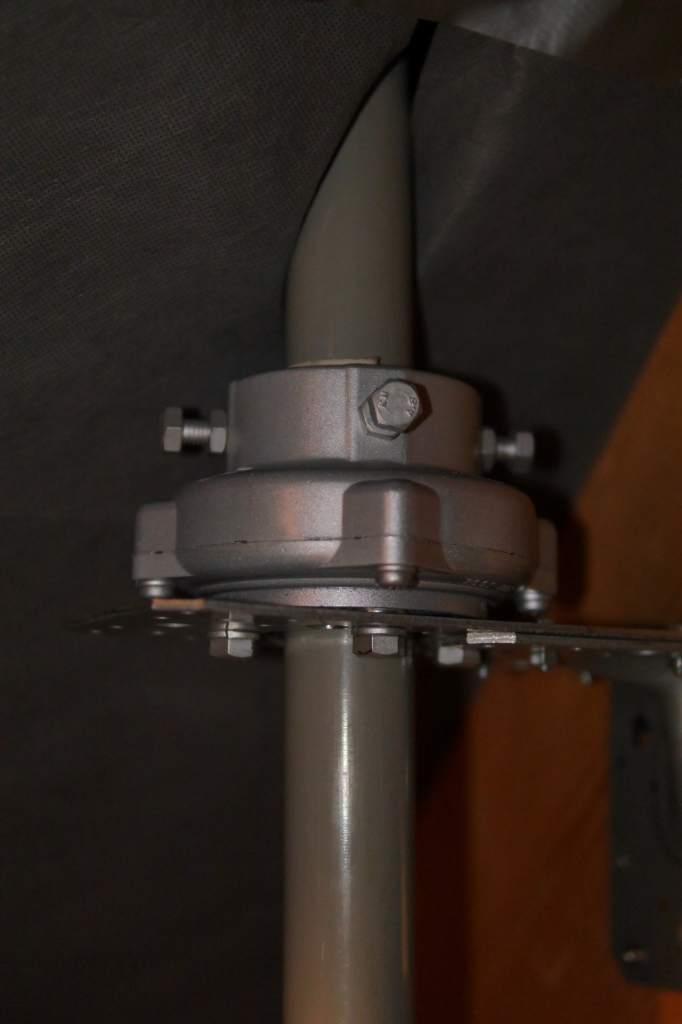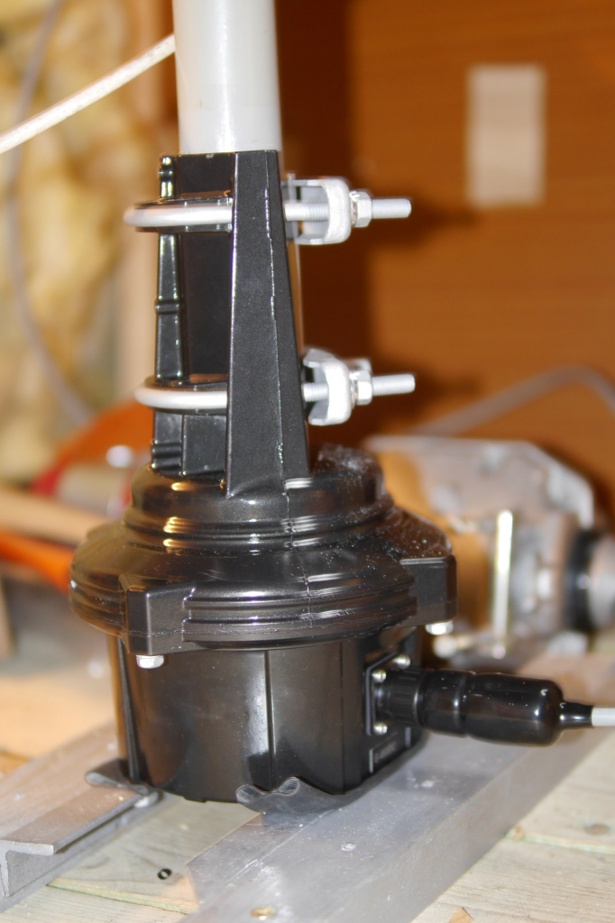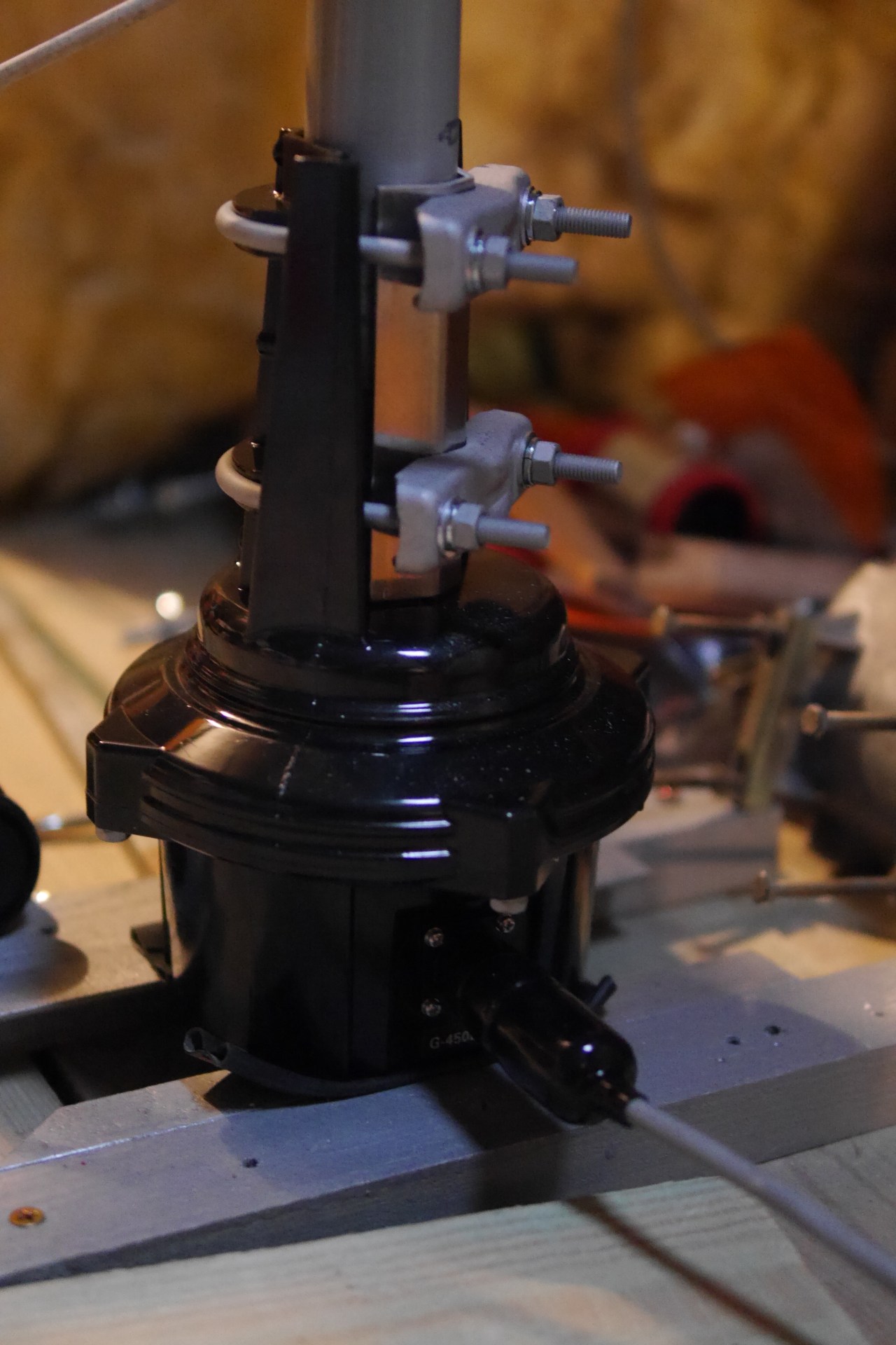 Nejprve jsem tedy musel vyřešit jeho uchycení. Použil jsem materiál co dílna dala, takže zbytky kovových L profilů jsem přišrtouboval na dřevěné latě. To celé natřel, ať to trochu vypadá a přišrouboval na podlahu na půdě. Venku by taková instalace jistě neobstála, nicméně pod střechou je více než dostatečná. Mezi rotátor a podstavec jsem vložil improvizovaný silentblok ze staré duše na kolo. Předchozí Hirschamnn byl totiž dost hlučný a prkna na půdě rezonovala. 450ka je ale velmi tichá a ani o ni nevím. Aby to celé mělo nějakou štábní kulturu, osadil jsem rovněž anténní ložisko Yaesu GS-050. Pro něj jsem vyrobil z plechových profilů držák, který jsem uchytil na krov. Předtím jsem používal náhradu ložiska v pododobě trubky v trubce, což by asi i nadále bylo dostatečné řešení, nicméně ložisko jsem měl a nebyl důvod jej nepoužít. Jako stožár je nadále použita část sklolaminátového heavy duty teleskopického stožáru, který prochází anténní taškou. Do budoucna bude tento stožár vyměněn za jinou sklolaminátovou trubku v celku, případně za hliníkovou trubku. Dalším bodem je totiž instalace anténního dvojčete. Nyní je stále umístěna jen jedna DAB anténa Vaten 10p, vč. nízkošumového zesilovače od Terozu. Jak toto napojit na hromosvodovou soustavu ale nevím. A to je také důvod proč je to nyní na sklolaminátové trubce a antény jsou odpojitelné. Možná někdo poradí....